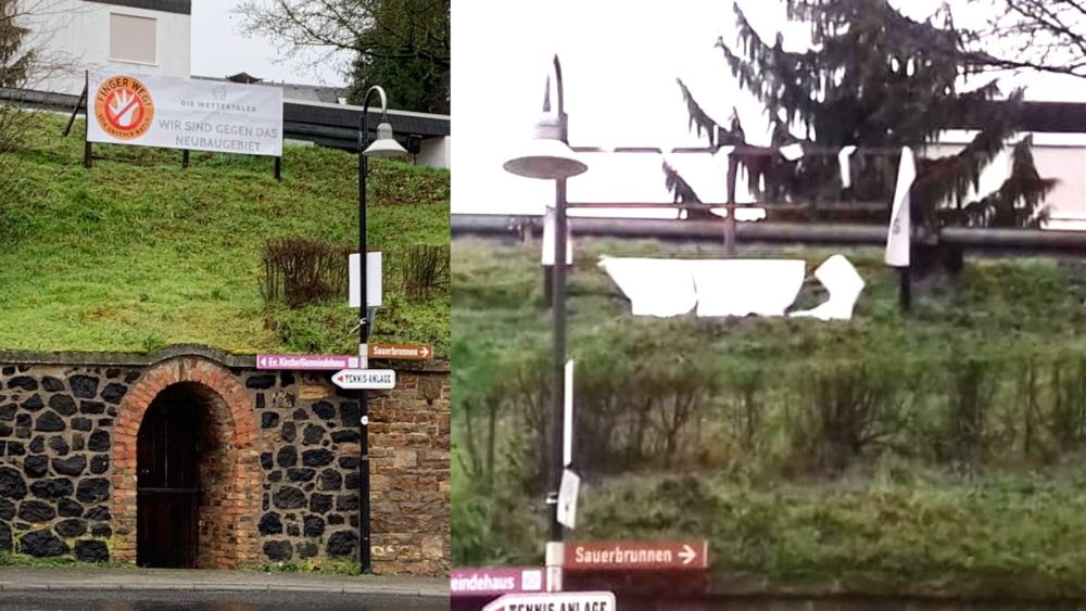 Unsere Protest-Banner-Aktion hat bereits nach kurzer Zeit hohe Wellen geschlagen. Das Banner, welches wir nach Rücksprache mit dem Vereinsring am Schwalheimer Kreisel aufhängen durften, wurde innerhalb von zwei Stunden mit blinder Zerstörungswut in Fetzen geschnitten.